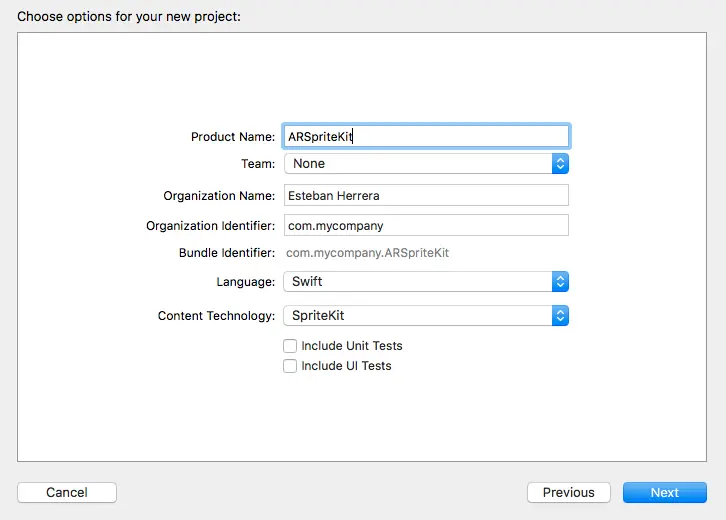 输入项目的信息,选择 Swift 作为开发语言并把 SpriteKit 作为内容技术,接着创建项目: