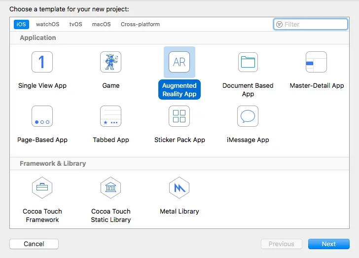 打开 Xcode 9 并且新建一个 AR 应用:
