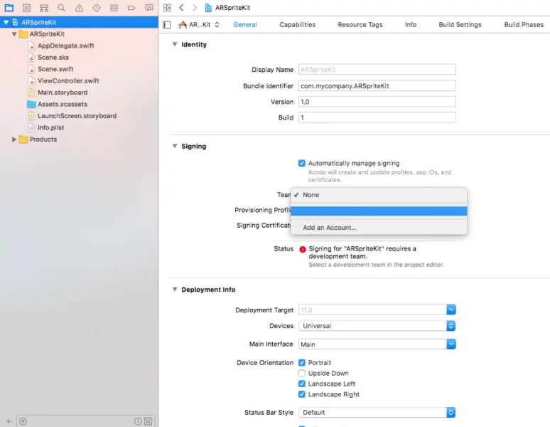 目前 AR 不能够在 iOS 模拟器上测试,所以我们需要在真机上进行测试。为此,我们需要开发者账号来注册我们的应用。如果暂时没有的话,把你的开发账号添加到 Xcode 上并且选择你的团队来注册你的应用:
