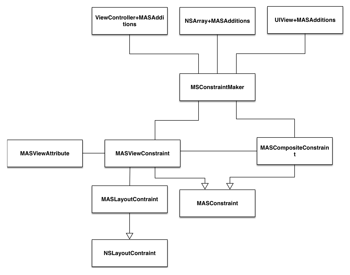 这几个类便是实现链式调用的关键,特别是 MASCompositeConstraints ,专门用来处理类似 make.height.width.equalTo(self) 的约束。