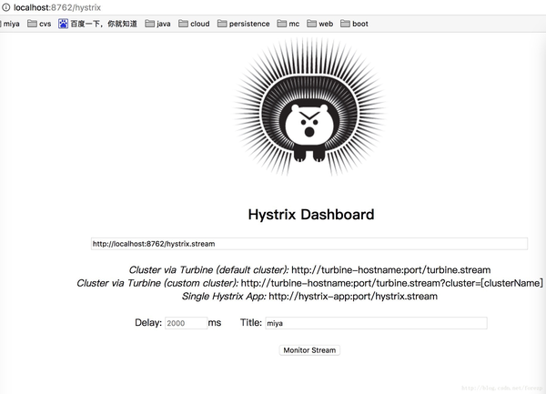 在界面依次输入:locahost:8762/hystrix.stream 、2000 、miya ;点确定。
