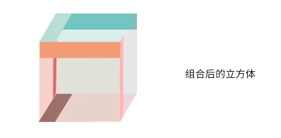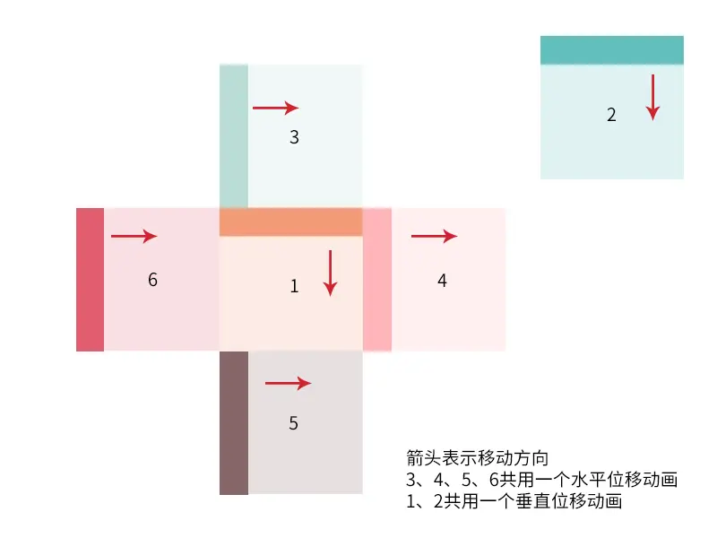 为了偷懒,我把位移动画分成了两类,立方体1和2共用垂直方向的位移动画,3、4、5、6共用水平方向的位移动画。组合后的立方体如下所示: