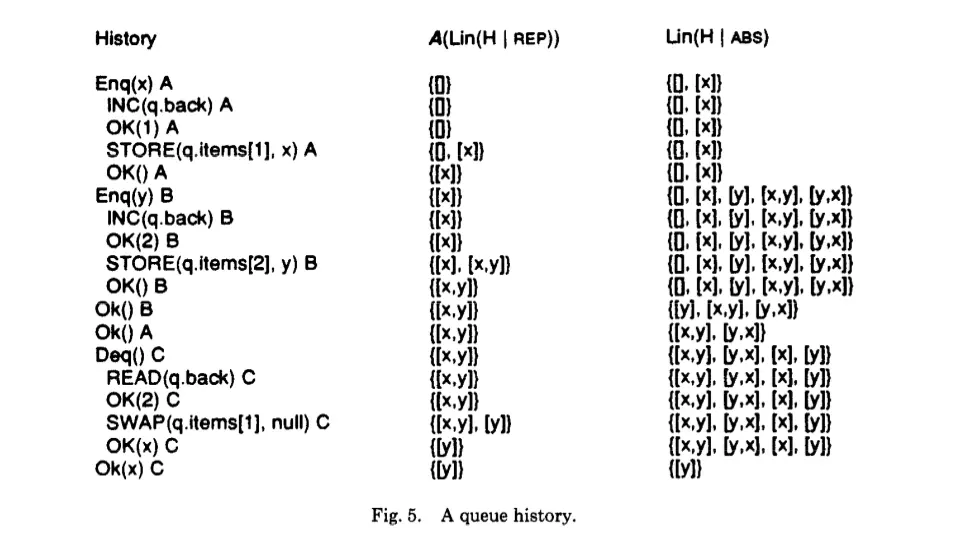 对线性化的历史的验证可以被转换为对顺序化历史的验证,对于给定的线性化历史,我们把最终线性化点的对象的值称为线性值。因为给定的历史可能有超过一个线性化点,所以这个对象可能会有多个线性值。我们用 Lin(H) 表示所有线性值的集合,可以把它们看作是系统外部的观察者所看到的值。