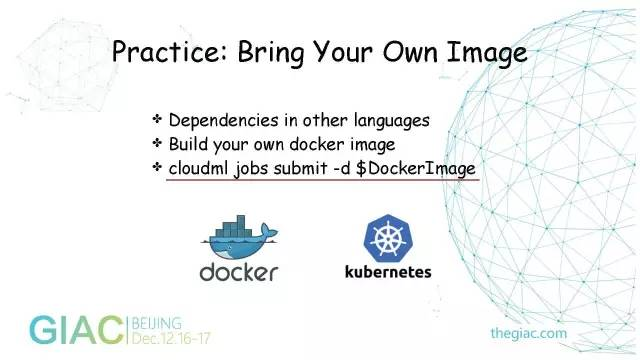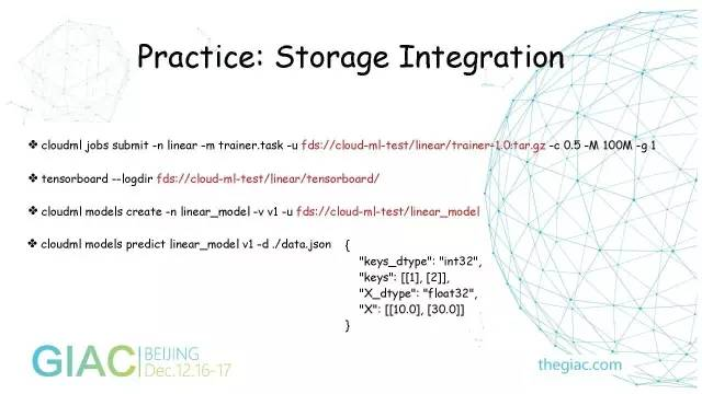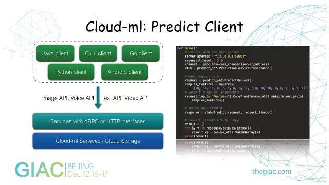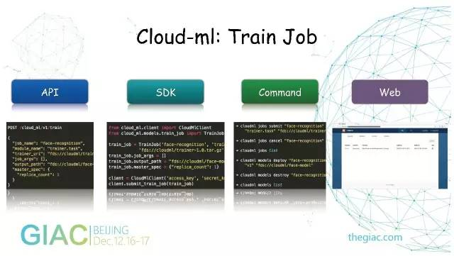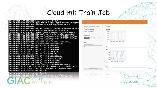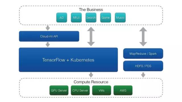 最上层是用户业务,有广告、搜索、游戏等,都有自己的业务场景,可以根据自己的数据格式编写一些Tensorflow、深度学习的脚本。通过Cloud-Ml的API把任务提交到服务端,由服务端创建一个容器,把它调用到真正的物理机计算资源上。