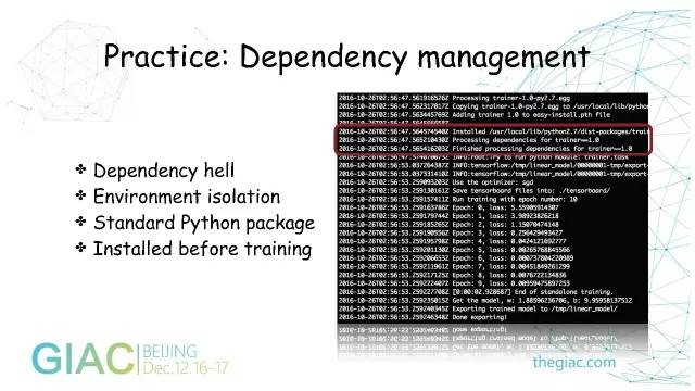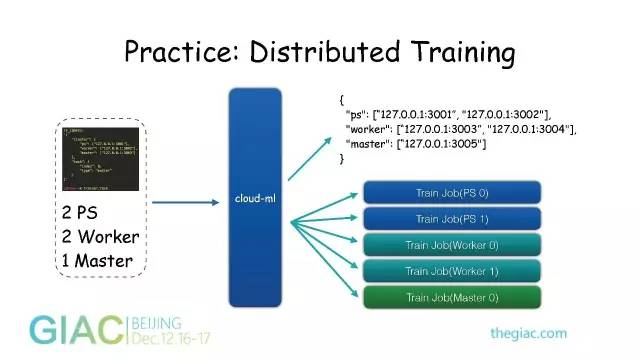 我们把用户的脚本拿出来以后,不需要它去管理服务器的环境,只需要声明这个集群有多少个PS、Worker和Master,把这些参数提交给Cloud-Ml的API服务,由它来申请可用的IP和端口。