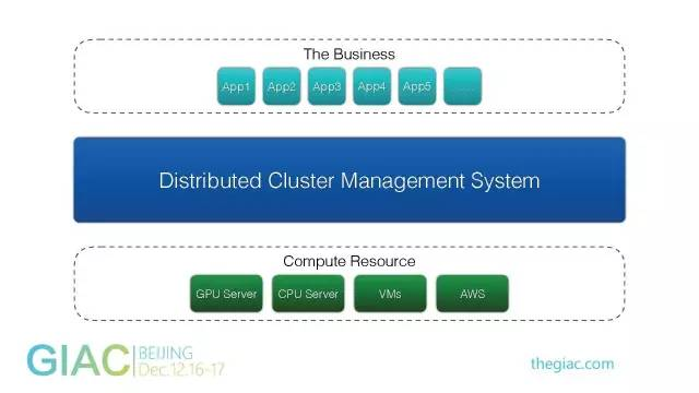 我们在中间引入一个分布式的管理系统,让上层业务应用不需要直接管理底层资源,由统一的调度系统去实现。