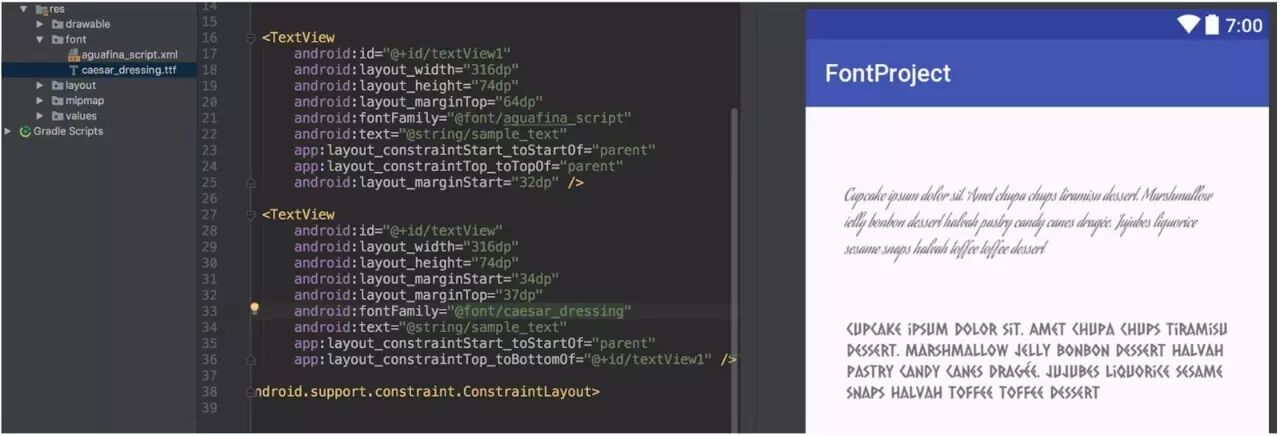 Android O 中已充分支持 Fonts 字体资源类型,允许开发者直接在 XML 布局中访问字体并定义字体系列。