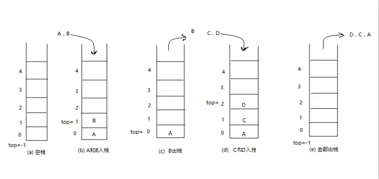 在前面的文章自己实现集合框架(十一):栈接口中介绍了栈的相关概念,那么什么是顺序栈呢?顺序栈指采用顺序储存结构储存数据元素的栈,比如采用数组来存放数据元素。栈的特点是只能在栈顶进行操作,后进先出,所以A,B,C,D四个元素的出栈入栈状态变化过程如下图所示: