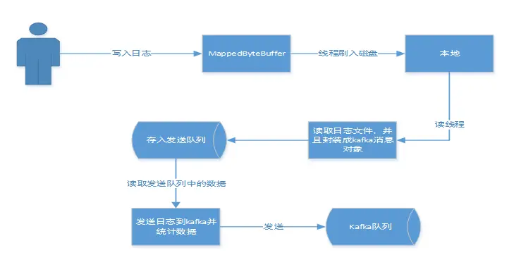 日志客户端给各个系统提供了一个统一的Api,就类似于Log4j这些日志工具一样,这样使得接入变得方便简洁,就和平常写日志没什么区别。这里需要提到的一个点是客户端对于日志的处理过程,下面我用图来给大家进行说明,如下图: