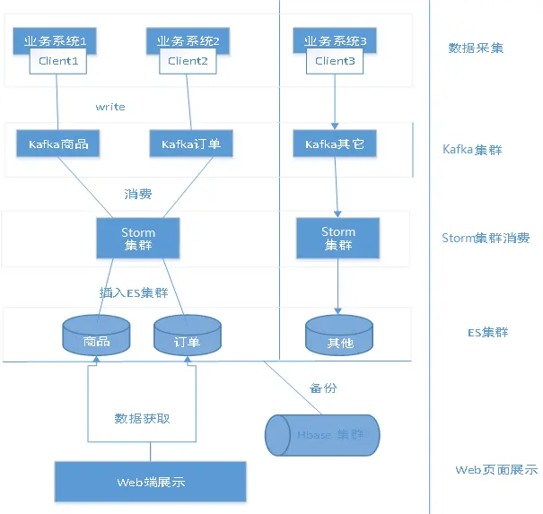 流程:日志客户端 - Kafka集群 - Strom消费 - ES -HBase - ...