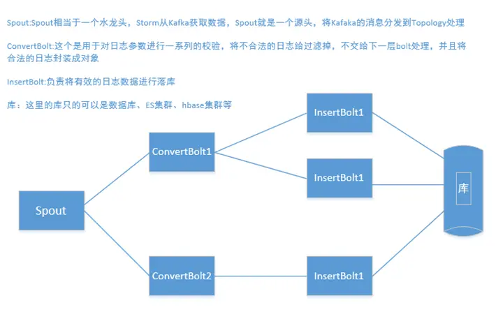 从上图我们可以看到Storm整个一个处理的流程,其中我们对日志进行了两次的处理,一次是校验是否有效,并且封装成对象交给下一个bolt,insertBolt负责将数据落库,这么一个流程看起来比较清晰明了。