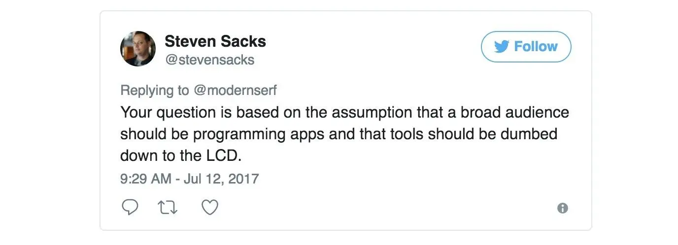 这让我回想起了我之前提出的一个问题:如果大多数的人都在错误的使用一款工具,那我们又该如何评价它呢?一个好的工具不仅仅应该有用且耐用 - 它应该让使用者有个好的使用体验。能舒服使用它的场景就是正确的场景。一个工具的设计不仅仅是为了它要完成的任务,同样也要考虑到它的使用者。一个好的工具可以反映出工具制作者对于使用者的同情心。