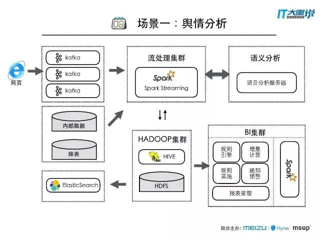 爬虫爬到kafka里面,进行流处理去虫去噪,再做语义分析,语义分析完之后将舆情数据写入ES,全量数据写入HDFS。