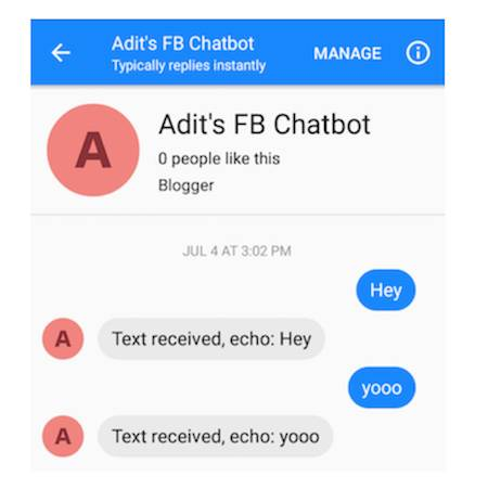 这个过程并不是太难,因为我花了不到30分钟的时间来完成所有步骤。基本的想法是,我们使用简单的express应用程序建立了一个服务器,在Heroku上安装它,然后设置一个facebook页面连接。但最终,你应该有一个类似这样的 Facebook 聊天应用程序。
