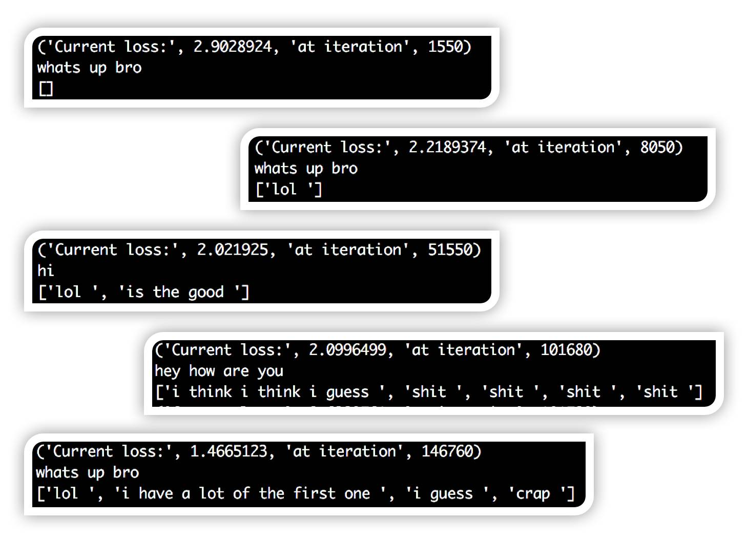 此脚本将创建两个不同的文件。其中一个是Numpy对象(conversationDictionary.npy)包含所有输入输出对。另一个是一个大的txt文件(conversationData.txt)包含这些输入输出对的句子形式,一个对应一个。通常,我喜欢共享数据集,但是对于这个特定的数据集,我会保持私有,因为它有大量的私人对话。这是最后一个数据集的快照。