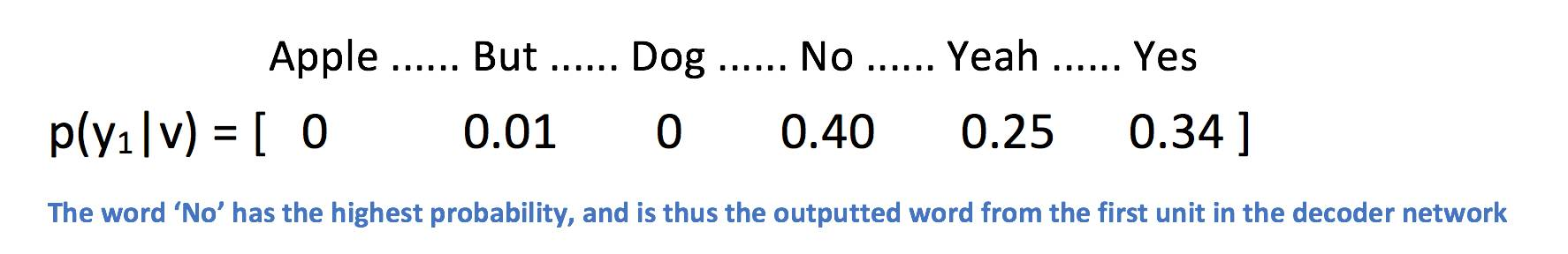 而解码器RNN负责接收编码器的最后隐藏状态向量,并使用它来预测输出应答的单词。让我们看看第一个单元。该单元的工作是使用向量表示v,并决定其词汇表中哪个单词是最适合输出响应的。从数学上讲,这就意味着我们计算词汇中的每一个单词的概率,并选择值的极大似然。