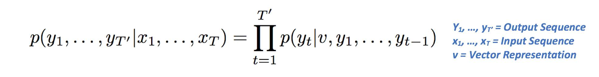 右侧包含p(yt | v,y1,…,yt),它是所有单词的概率向量,条件是在前一步的向量表示和输出的情况下。其中pi等价于西格玛(或累计求和)的乘法。则右侧可降为p(Y1 | V)*p(y2 | v,y1)*p(Y3 | v,y1,y2)
