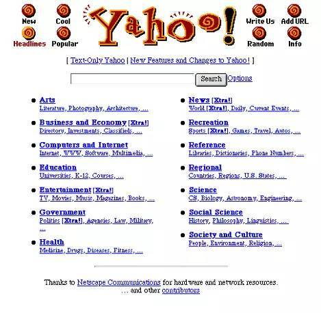 我出生在上古时代的浏览器Netscape中, 那个时候的网页真是乏善可陈, 你可能都想象不到, 主要是些丑陋的静态文本和简单的图片, 和现在美轮美奂的页面相比,差的实在太远了, 不信你请看著名的Yahoo 网站:
