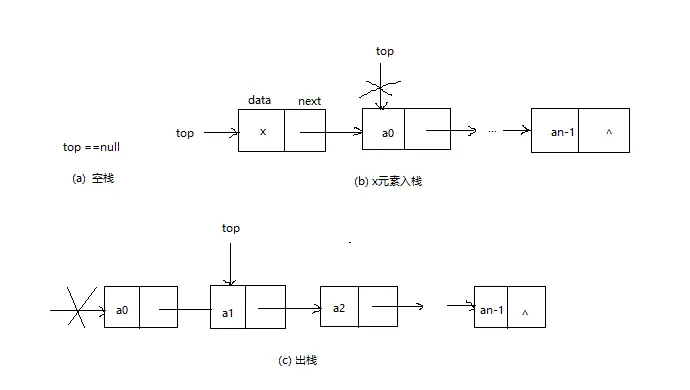 采用链式储存结构的栈叫做链式栈,采用单链表来实现。单链表的第一个结点为栈顶结点,设top指向栈顶结点,入栈操作是在当前栈顶结点之前插入新的结点;出栈操作是删除当前栈顶结点并返回栈顶元素值,再使top指向新的栈顶结点。链式栈的空栈(a),入栈操作(b)和出栈操作(c)如下图示所示: