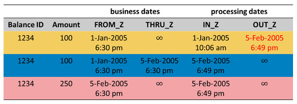 API的开发需求来自于已使用双时态存储的真实世界应用。对API的更全面介绍,参见“Reladomo Kata”中的双时态章节内容。下面让我们看一个例子。如果我们基于交易活动存储一个账户的余额量,在两次交易后,余额在数据库中如下图所示: