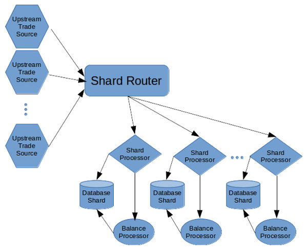 交易来自于各种上游的源。它们被路由到适当的分片,并在分片中做处理(通常是以FIFO的方式)。可以将不同分片上的操作安排为完全独立的。该架构可以很好地扩展到上百个分片,很容易实现对上百万交易的处理。
