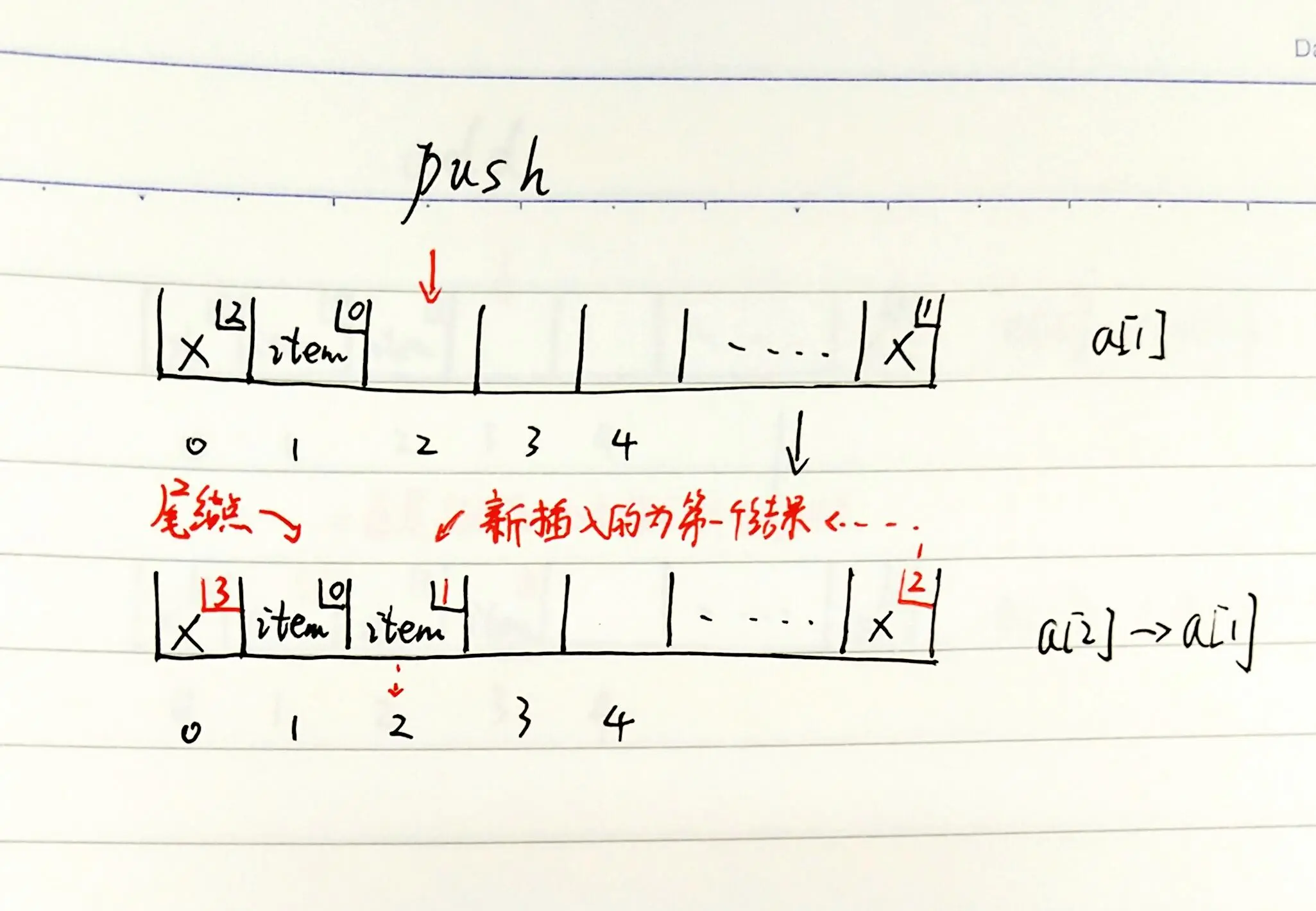来看push方法,先获得备用链表的第一个空闲位置。因为是在表头插入,所以新结点的next指向原链表的第一个结点(即数组最后一个元素的next处所在结点),接着数组最后一个元素的next应该变成新结点的下标。如果第一次添加结点到链表中,那么这个元素也是链表的尾结点。由于刚初始化后数组a的最后一个元素的next为0,根据push的实现,新结点的next为0。这和我们定义的链表尾结点的next约定为0符合,所以现在知道为什么初始化的时候要令a[capacity - 1].next = 0了吧。同时数组最后一个元素的next指向新插入结点的下标。