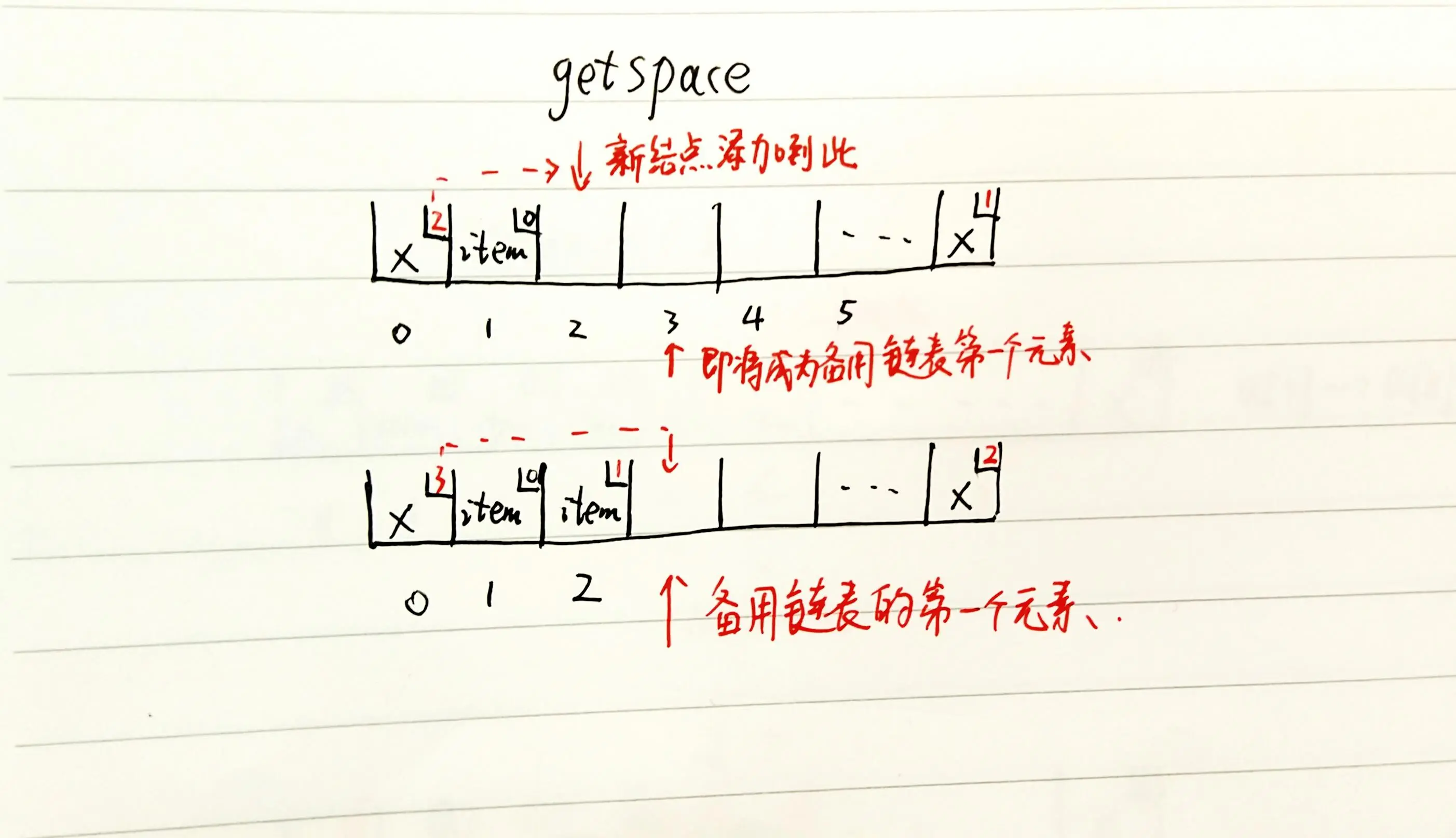 当添加结点的时候,放进数组的哪个位置呢,自然是备用链表的第一个元素了。同时备用链表的第二个元素变成了第一个元素。用代码表示如下