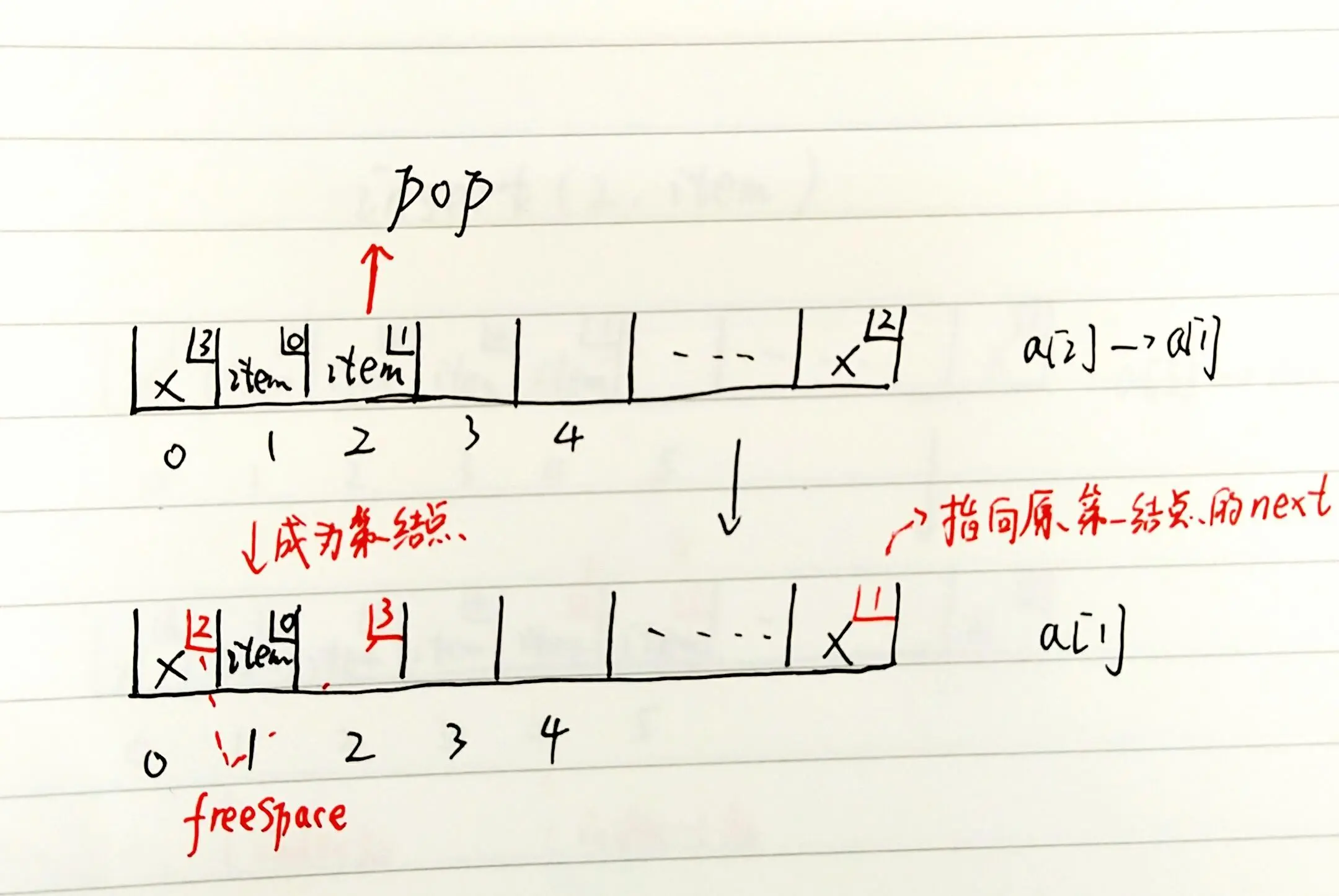 然后是pop方法,用index变量保存了第一个结点的索引,一会儿要调用freeSpace来更新备用链表。然后数组最后一个元素的next指向原链表的第二个结点,这样它也就成了链表的第一个结点。