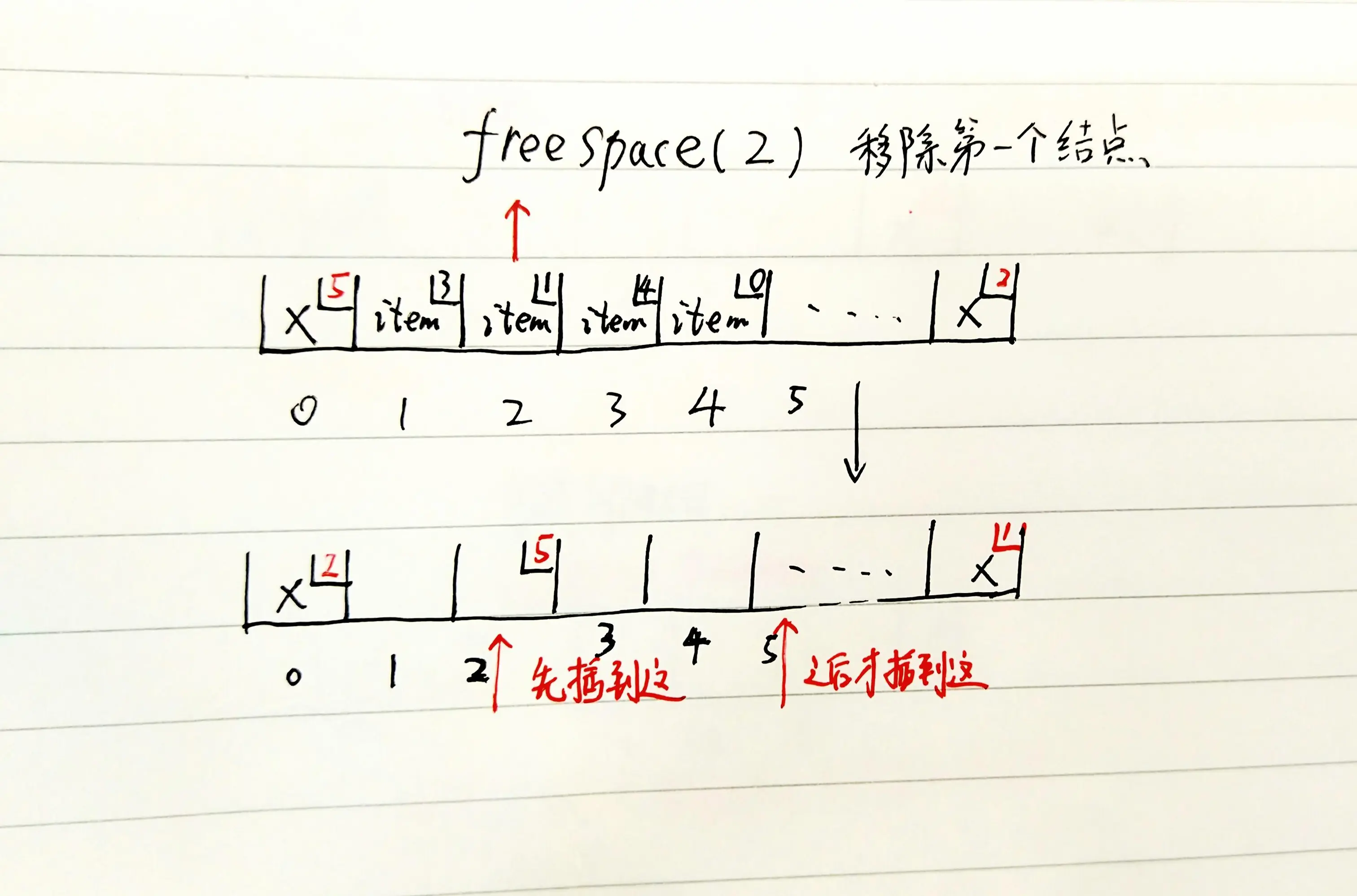 相应的,当有结点被移除,被移除处成为优先插入位置,即如有新结点要插入,先插入到刚刚被移除结点的位置,接着再插入到原备用链表的第一个元素处。