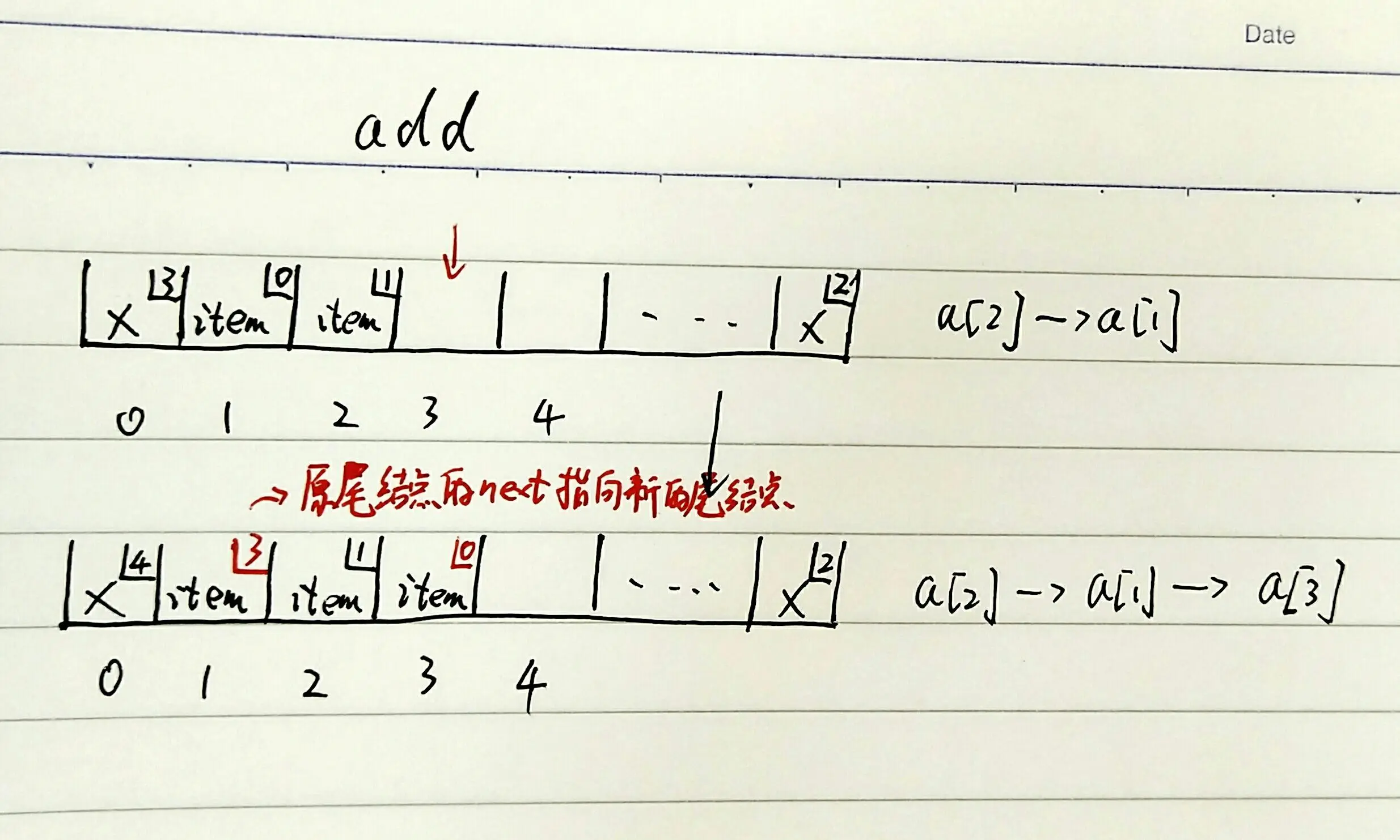 对于add方法也一样适用,第一次添加结点的时候,while循环不会执行,最后一个元素的next指向刚添加结点的下标,手动将第一个结点的next置为0;对于之后的add操作,则是通过while循环找到链表的尾结点,该结点的next指向新结点的下标,表示刚添加的结点成为了新的尾结点。再手动将尾结点的next置为0。