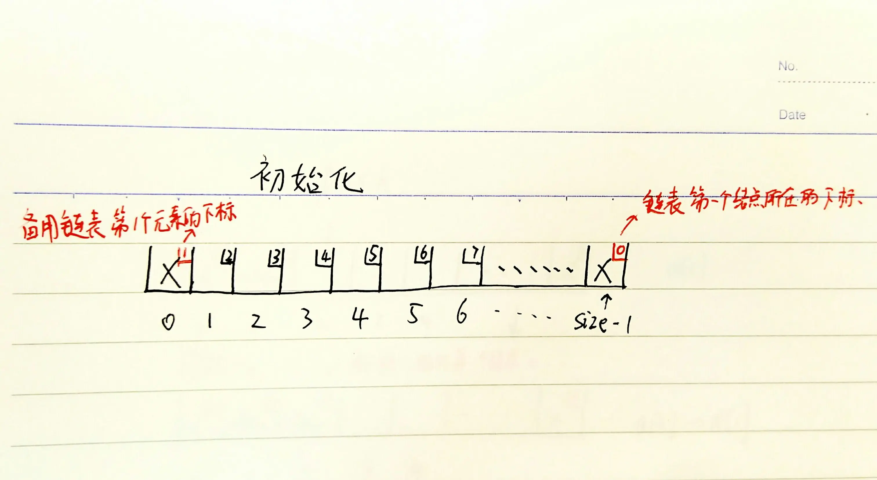 此时数组只是规定了大小,里面其实还没有内容。所以需要进行初始化,用new Node<>填充数组的每一个位置。data域初始化为null就行,next域的初始化就有讲究了。按照约定,数组的第一个位置a[0]和最后一个位置a[length - 1]不表示结点,不仅data为null,next表达的意义也比较特殊。如果将未使用的数组元素称为备用链表,那么a[0]的next始终指向备用链表第一个结点的下标——也就是第一个空闲元素的下标。a[length - 1]的next始终指向链表第一个结点的下标。由于刚开始还没有结点,链表为空。所以a[0].next自然是第一个空闲元素a[1]的下标1,a[length - 1].next则应该等于0,为什么是0下面会解释。