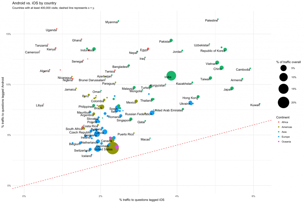 Again, pretty cool in the Americas and Europe, and warmer in Asia, particularly China and Japan. Interestingly, we can see there’s almost no traffic to iOS questions from Africa. Unlike Android, there’s no correlation, positive or negative, between iOS traffic and per-capita GDP. This suggests that the correlation between Android and GDP may not be driven entirely by the market share of the platform in each country.