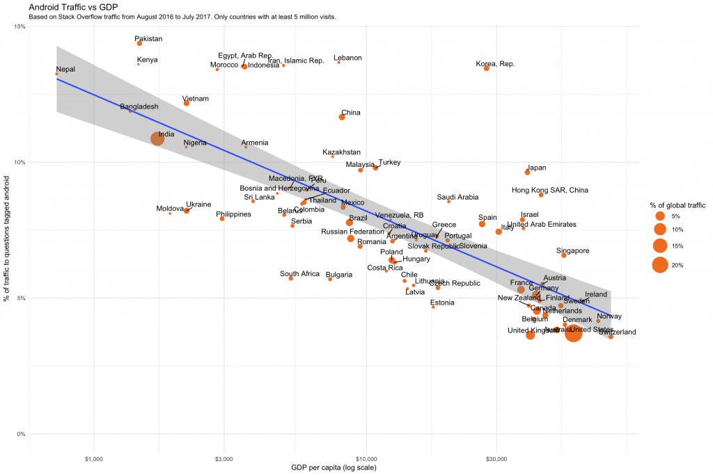 We geocode all of our traffic and know every question’s tags, so we can plot the percentage of traffic from each country that goes to questions with the Android tag.