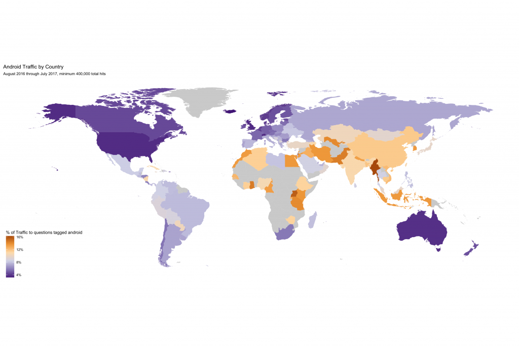 Android is decidedly less “hot” in the Americas, Europe, and Russia: it makes up only a small percentage (4-8%) of Stack Overflow question views from those countries. It makes up a much larger share (12-16%) of traffic in Africa, the Middle East, and Southeast Asia. What patterns could be behind this geographic distribution?
