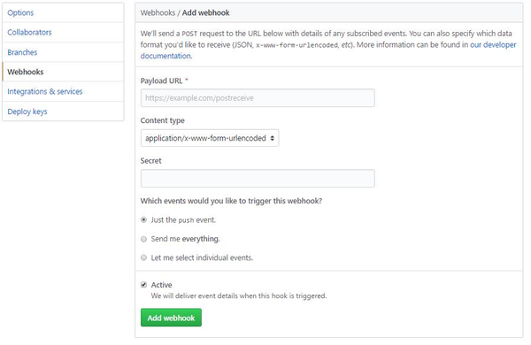 如此一来,你就可以通过这种方式去自动完成一些重复性工作,比如,你可以用Webhook来自动触发一些持续集成(CI)工具的运作,比如Travis CI;又或者是通过 Webhook 去部署你的线上服务器。下图就是github上面的webhook配置。