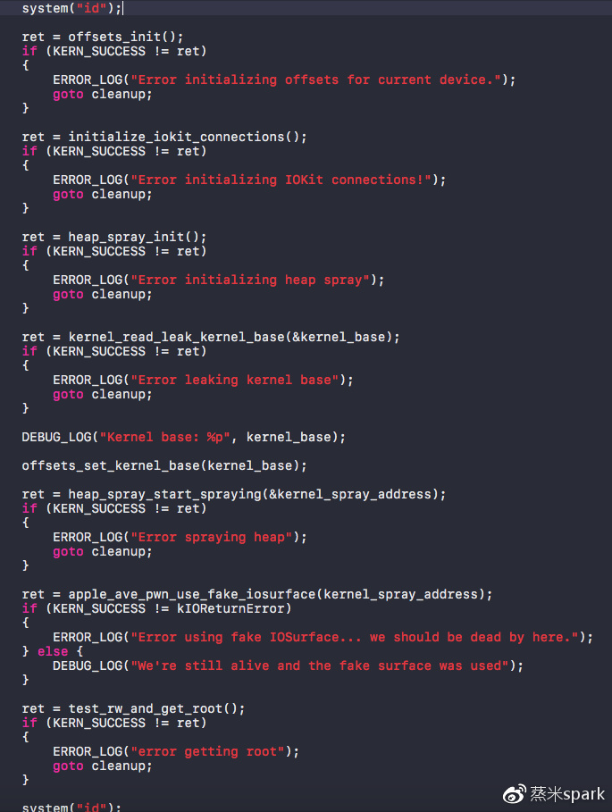 5. kernel_read_leak_kernel_base()首先利用了AppleAVE.kext的CVE-2017-6989内核信息泄露洞获取了IOSurface对象在内核堆上的地址,然后利用IOSurface的一个race condition漏洞(貌似是CVE-2017-6979)获取了IOFence的vtable,从而计算出kernel slide。