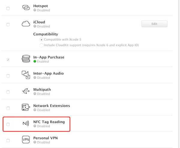 2.在TARGETS>Capabilities中打开Near Field Communication Tag Reading