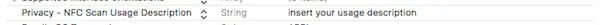 //告知用户在程序中使用NFC的说明,当扫描时该信息将显示给用户,该属性与NFCReaderUsageDescription键中的不一样