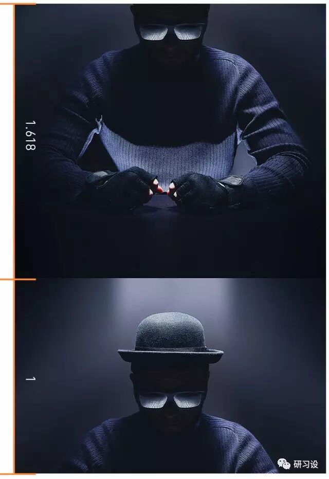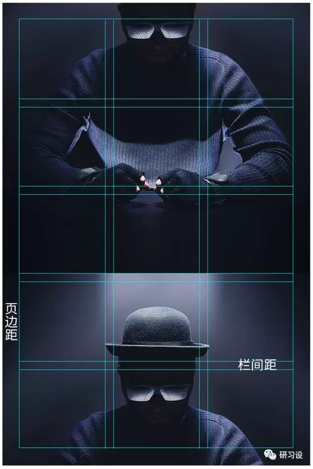 构图方面,上下照片的分割处于大概黄金比例的位置上,第二张图根据顶部人物眼镜的高度作为页边距离的依据,纵向网格划分了三栏,宽度是一个帽子的宽度。横向网格划分了五栏,底部图片高度占据两栏高度,顶部图片占据三栏高度。这里栏间距设置为页边距的2倍。