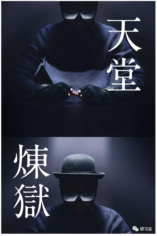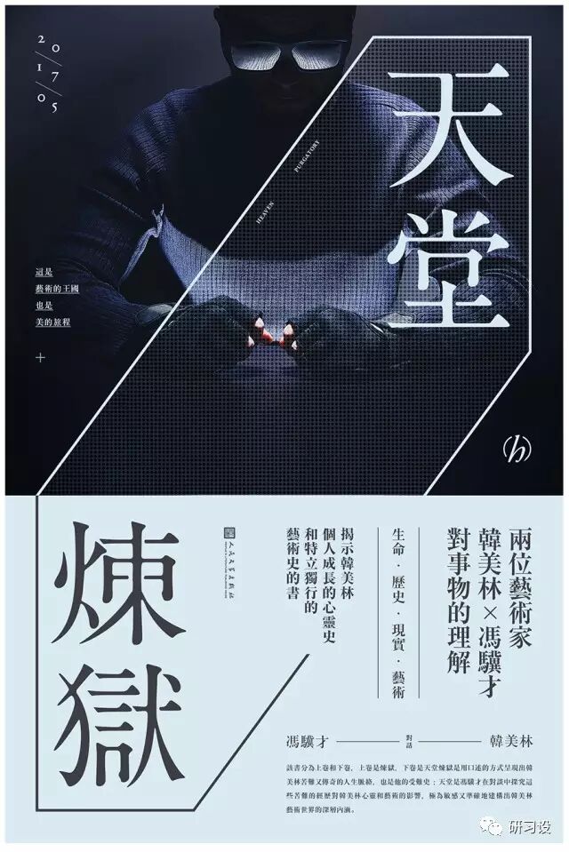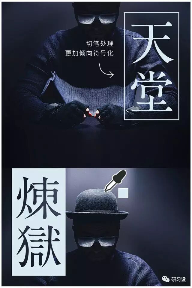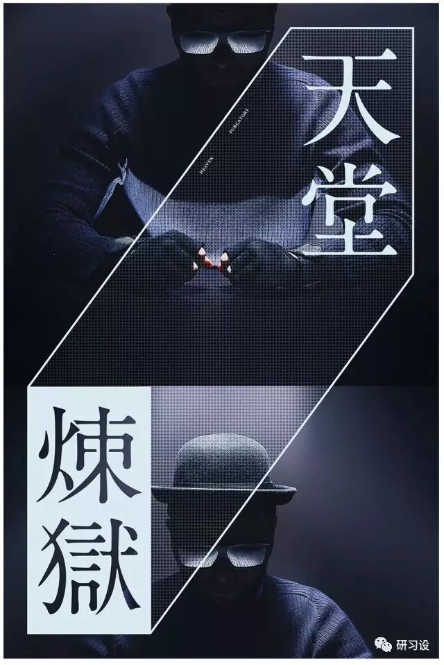 接下来将文案信息整理好并放置到版面中,注意所有信息都应该编排在版心内,将标题信息放大后分别放置在版面的对角线上以保证版面的平衡,根据纵向文字阅读逻辑通常是从右上到左下移动,将天堂放置在版面右上方,炼狱放置在版面左下方。