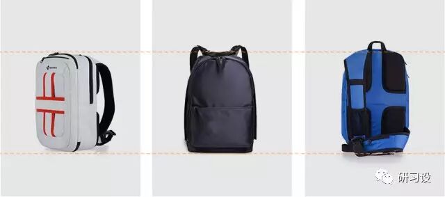在日常工作中,往往会遇到图片互相并列编排的情况,上图中是将各种背包裁剪成统一尺寸的案例,画面尺寸的统一,也意味着图片内部背包的大小也需要统一。通过将背包的高度与底部对齐来试图让背包的大小达到统一,但结果却发现第一个背包与第三个背包的大小看上去却完全不一样。