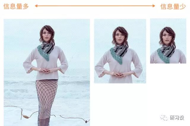 如果图片本身的信息量比较大,在小尺寸的应用中,就会显得非常复杂。我们可以通过裁剪的方式,将画面中的主体放大处理来简化信息量,使其在小尺寸依然可以轻松识别。上图中虽然画面的尺寸变小了,但我们依然能够识别出模特的面容。也就是说,版面中照片的信息量越大越适合大尺寸下的应用,照片的尺寸越小,越需要简洁的画面。