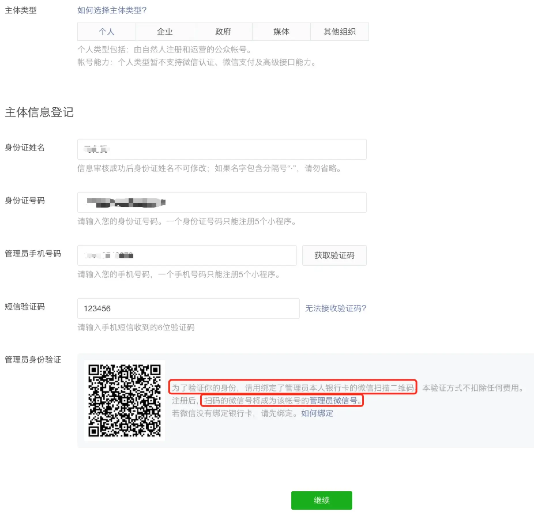 6. 信息登记的主体类型,请根据自己的情况而定,本教程采用最基本的 个人 类型,并填写下面的真实信息,需要注意的是,身份证 和 手机号 最多能绑定 5 个小程序,也就是说,你想要开发第 6 个小程序,就需要换别人的证件信息了。