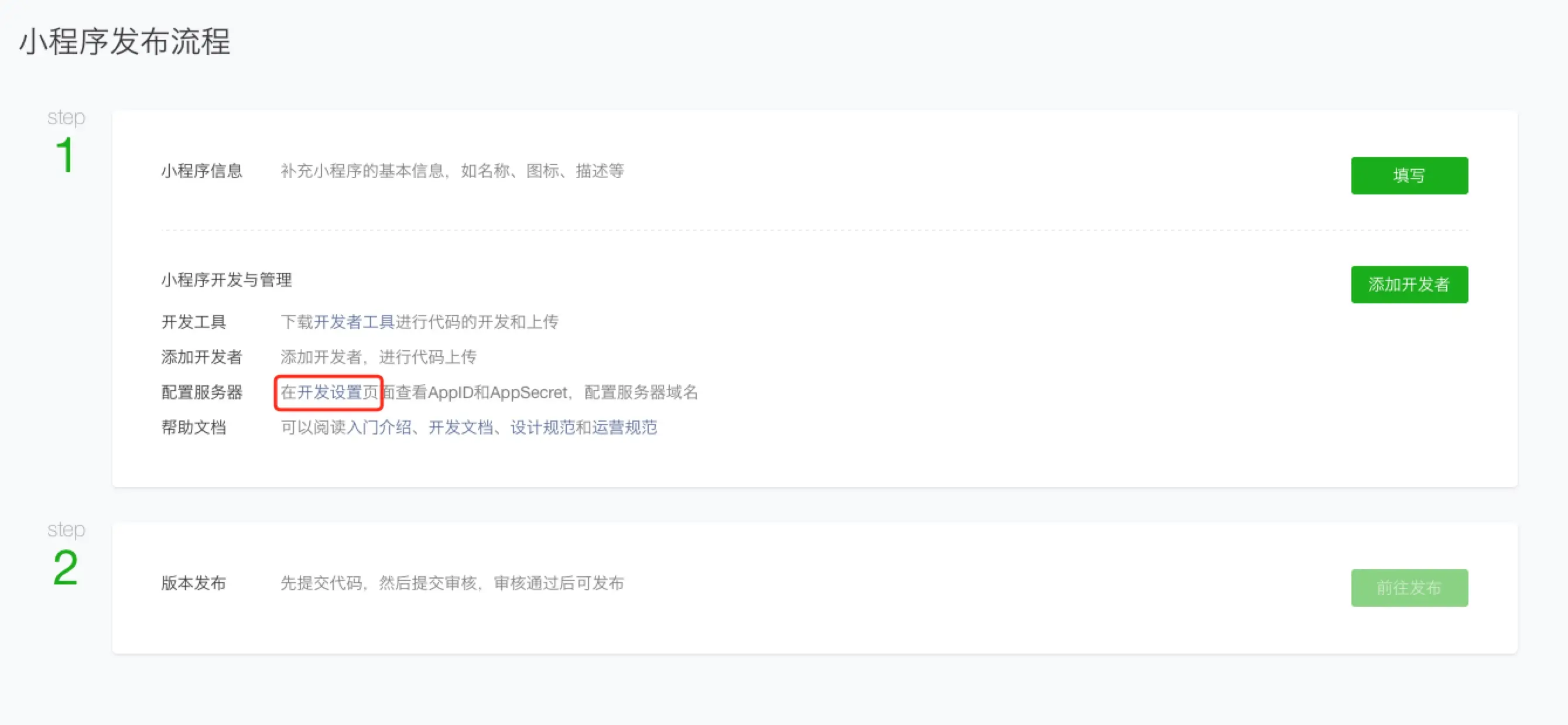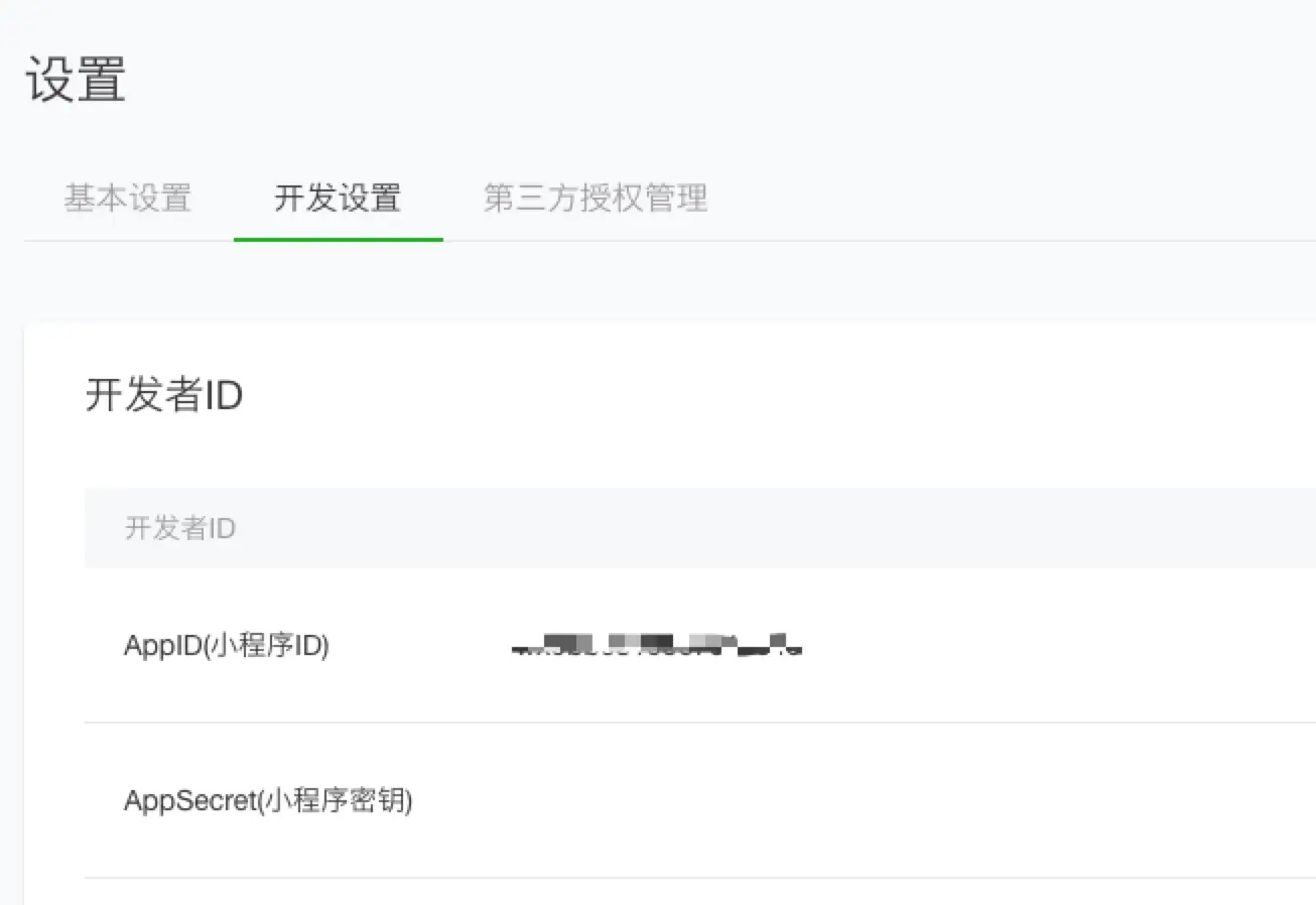 8. 进入小程序后,从左侧菜单导航的 设置 进入到 开发设置,或直接在图中所示位置进入 开发设置,就可以看到小程序的 appID了。