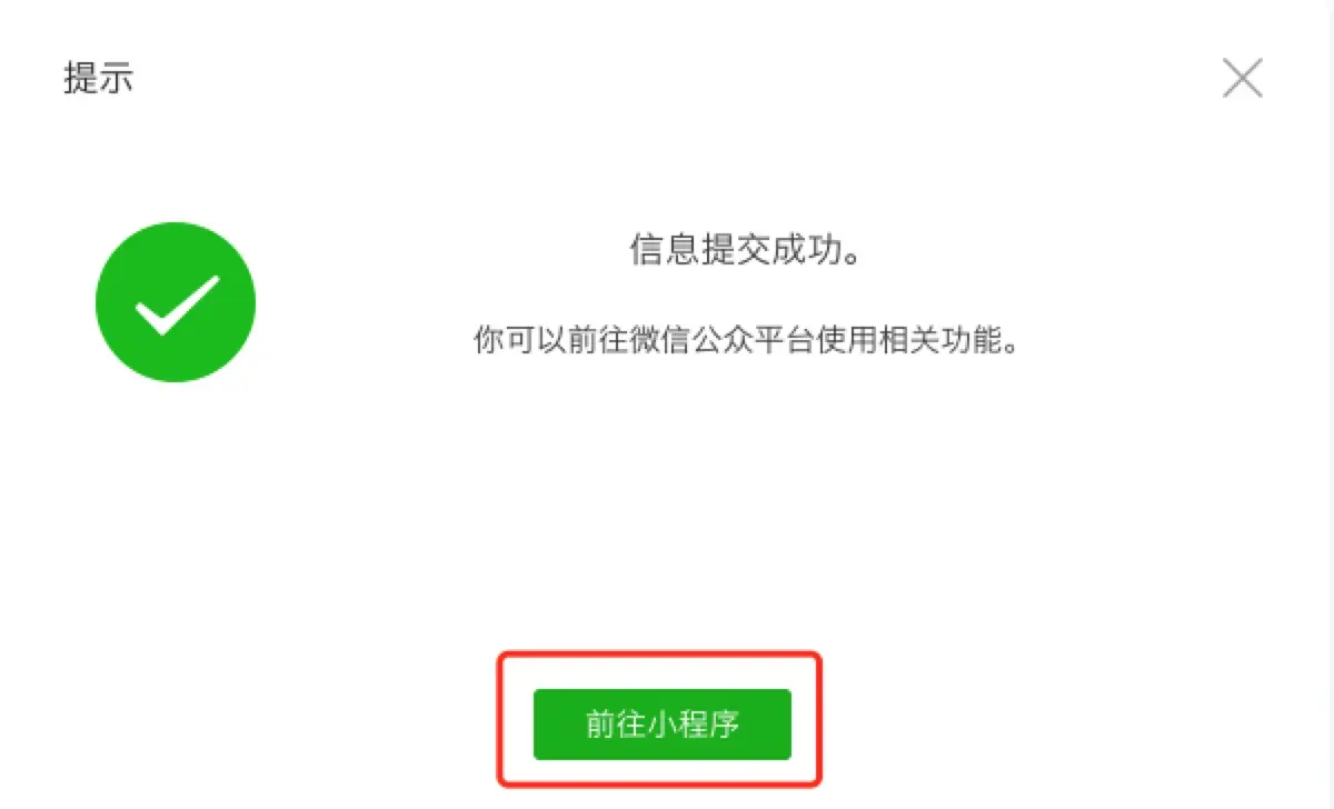 7. 信息填写后,点击 继续 进行提交,成功后会弹出如下框,直接 前往小程序