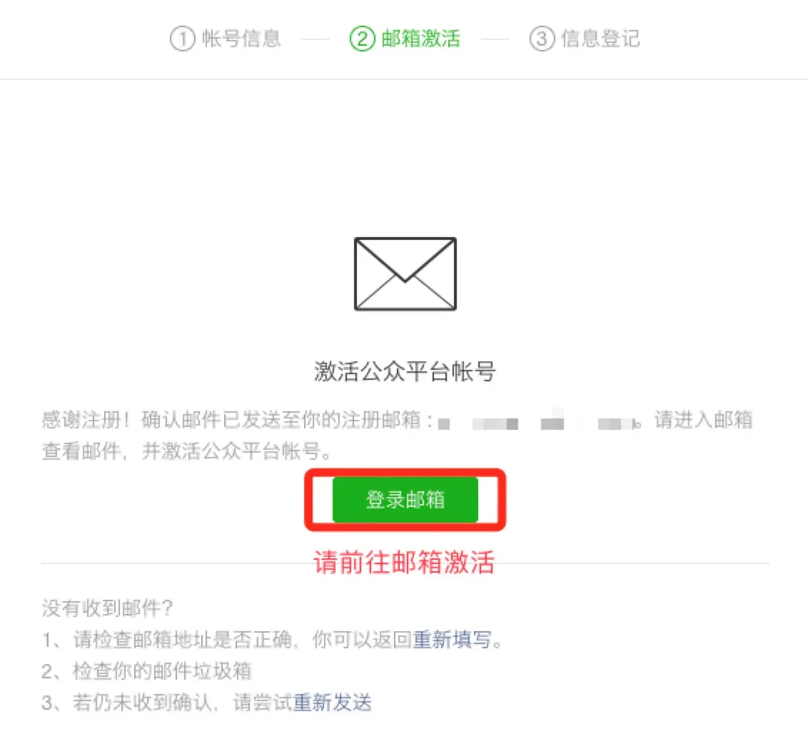 5. 点击邮件的链接验证后,正常情况下,会跳转到一个新的页面,如果打开页面后,没有进入到如下页面,可以点击页面 返回首页,或直接访问地址 mp.weixin.qq.com