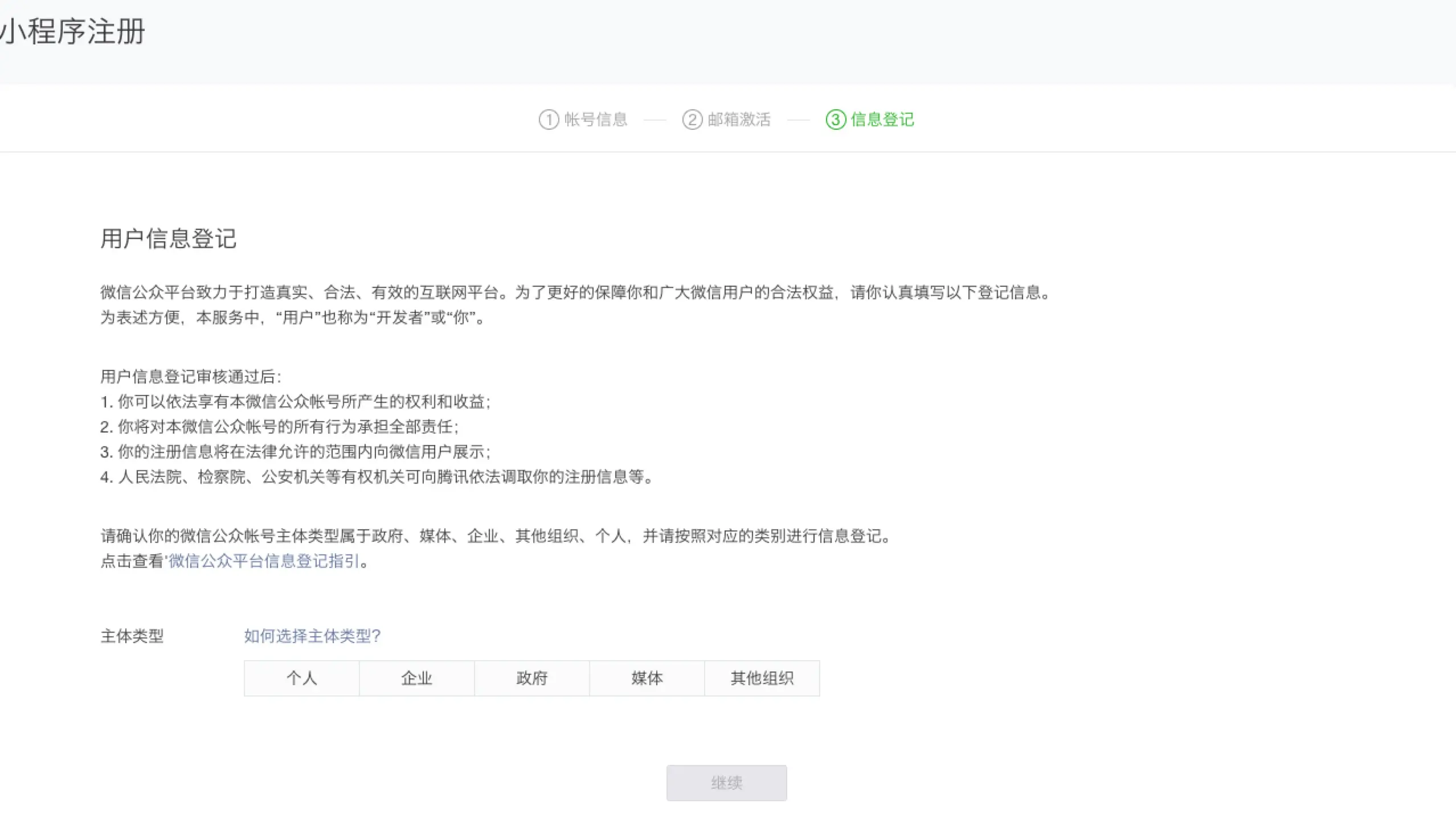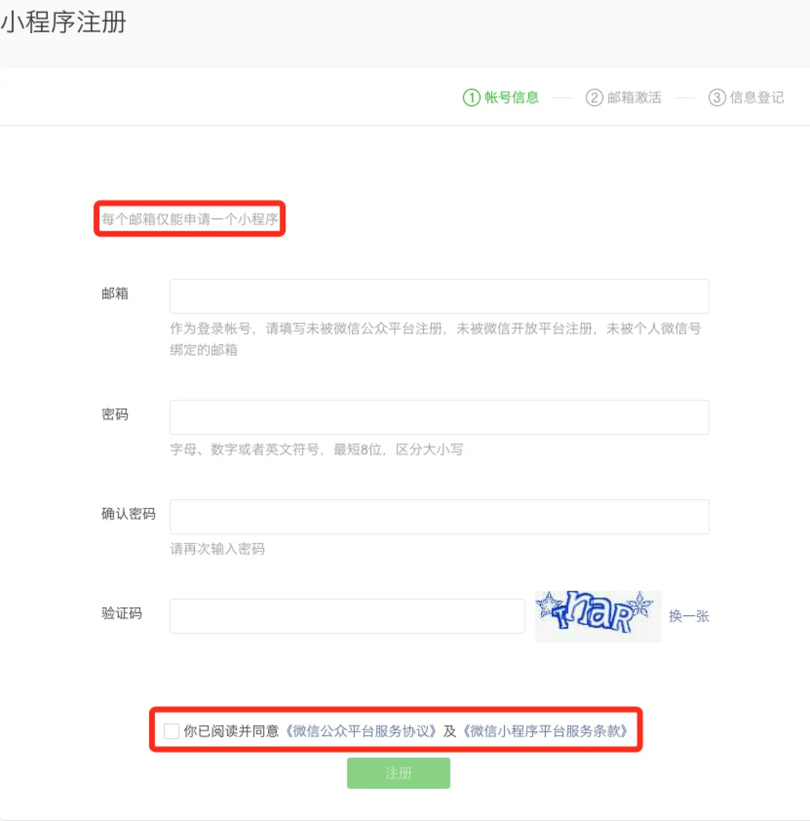 2. 不用多说了,直接填写信息吧。需要注意的是:一个邮箱只能注册一个小程序 。另外,多了解下协议内容,避免因一些小问题造成审核不通过。
