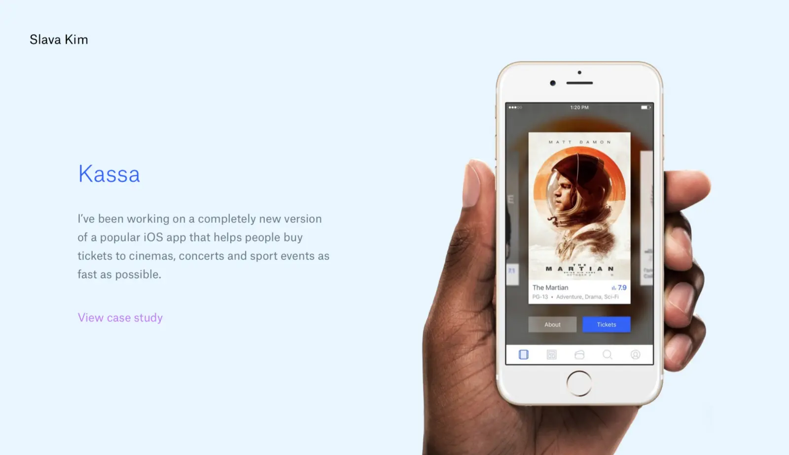 Slava Kim 的UX设计作品集当中,大量使用图片素材对整个设计项目进行说明和支撑,这样的设计使得他有足够的素材来创建强视觉化的作品集。