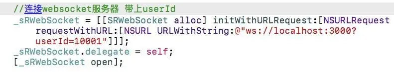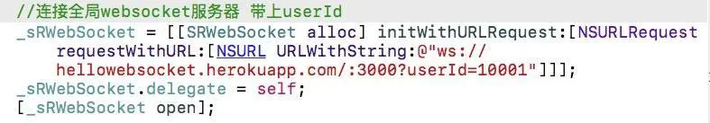 细心的小伙伴发现了,我们用index.html连接websocket服务器时后面带了一个userId参数,好吧暴露了其实我们连接的时候url后面是可以加参数的,我们暂且就先用这个来和websocket连接做一个映射吧,我们这一步不使用index.html,我们用iOS端连接并带上参数userId,然后在终端打印出来userId参数的值;有人问了,userId我在iOS请求时加上,那么在websocket服务器那边怎么收到呢?这个问题问的很好,我们来做一下实验,首先我们先改造一下iOS连接的代码,如下:
