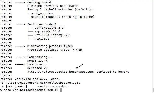 首先,你要有个heroku的账号,然后安装heroku-toolbelt.pkg工具(我们假设完全终端里操作,不在heroku官网操作),地址在这里https://devcenter.heroku.com/articles/heroku-command-line,然后安装,然后终端进入我们的目录中(一直都是hellowebsocket文件夹哦),执行heroku login(输入密码时是没有回显的),然后初始化一个git工程,执行git init,创建一个heroku项目,执行heroku create hellowebsocket(后面的名字自己看着办,如果有错误回提示你的,重新想一个就是了)然后你会看到两个地址(前面的就是你的全局地址咯,现在还访问不了,慢慢来,后面的是你的git地址),这时候我们执行git remote add hellowebsocket https://git.heroku.com/hellowebsocket.git(第5个参数是你的git地址,用你自己的),